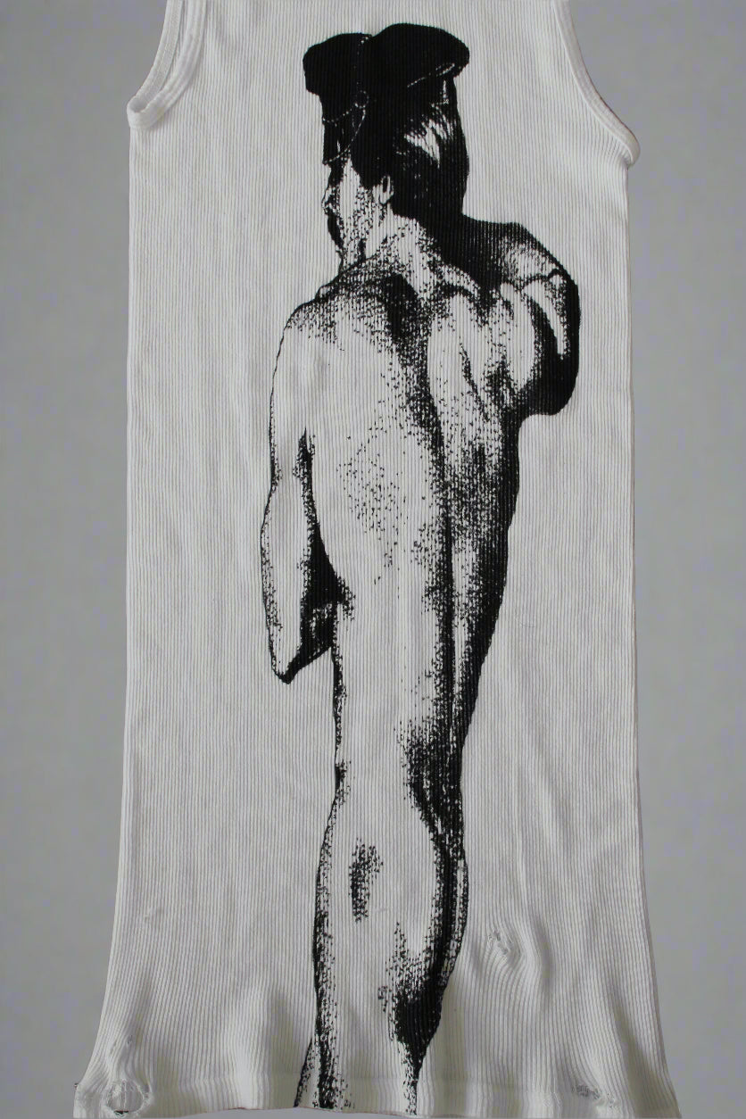 Club LL International Collection 001:Homme Boys Cotton Ribbed Tank Top with graphic. This fitted cotton ribbed tank features our signature graphic on the front and a stitched accent label on the back. Each piece is handmade, giving every tank its own unique finish. Available in sizes S-XL, Mack wears a XL for reference.